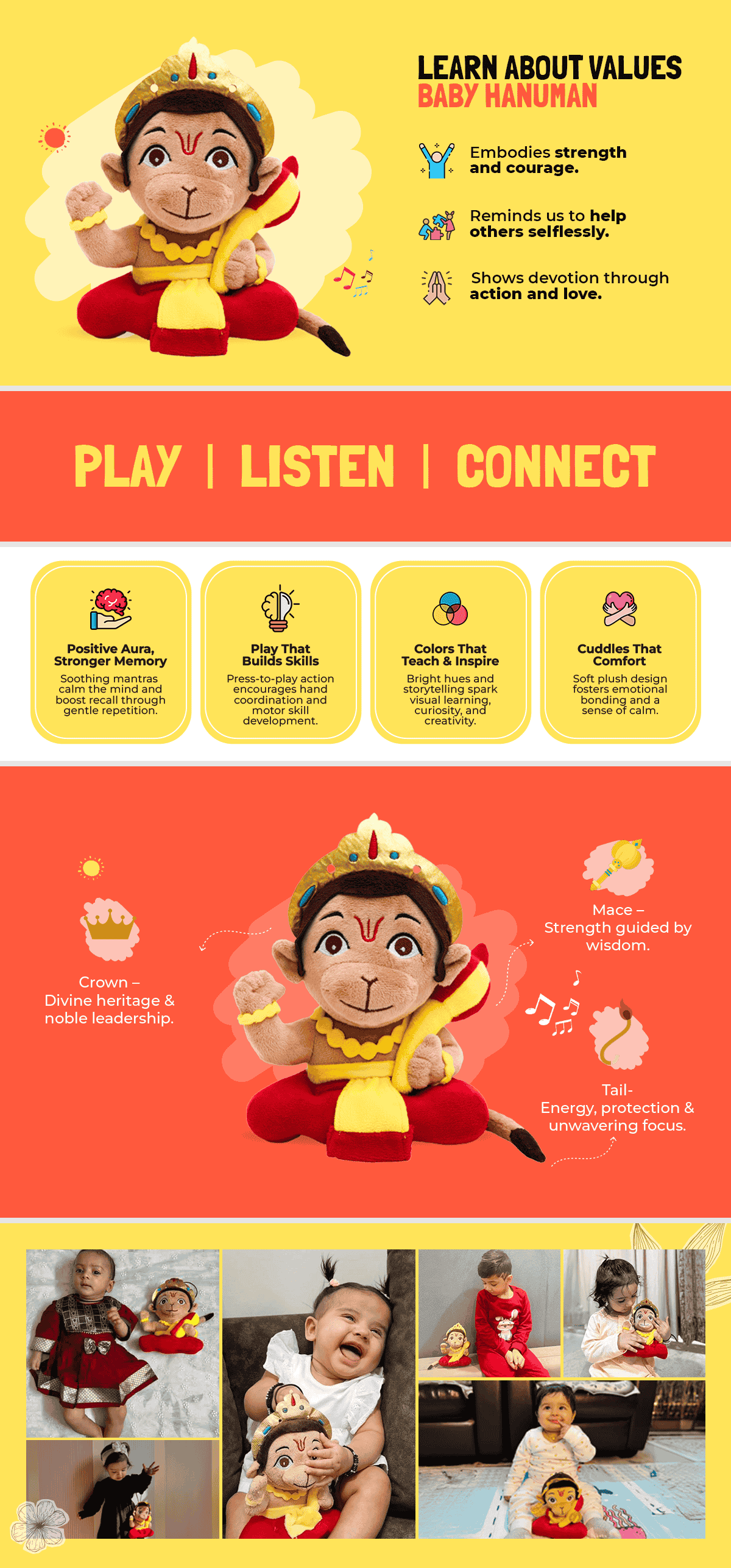 I would highly recommend this great product since it would help build their strong faith in God alongwith their development of sensory perception. Though our baby is too small to perceive the concept of God Hanuman , yet we feel to provide her with positive vibes by just playing the hanuman mantras. Also, the customer support service that I got was praiseworthy n satisfaction. 😇