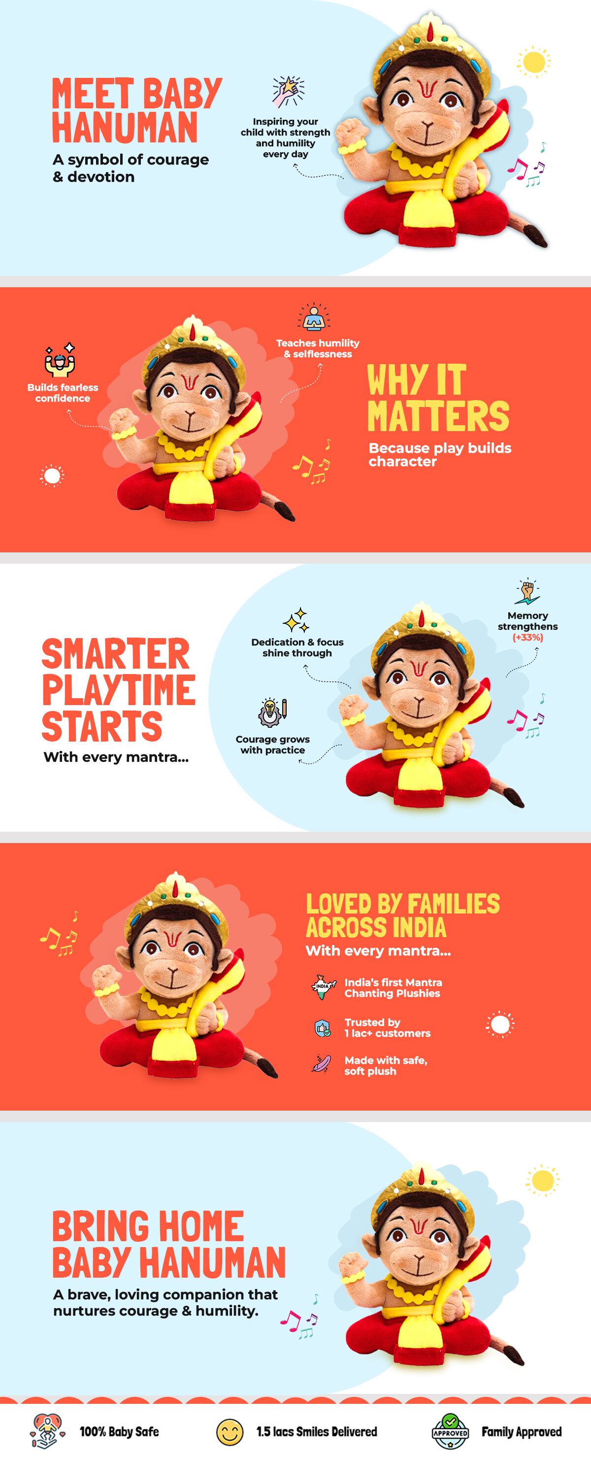 • Introduce infants and toddlers to Hanuman ji, the mighty protector and symbol of strength, devotion, and courage.