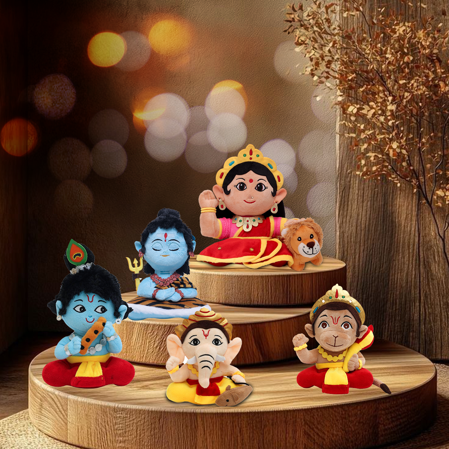 - A delightful combo featuring 5 beloved deities ā Krishna (love), Ganesha (wisdom), Hanuman (devotion), Durga (bravery), and Shiva (strength) ā offering a powerful introduction to Hindu mythology through cuddly play.