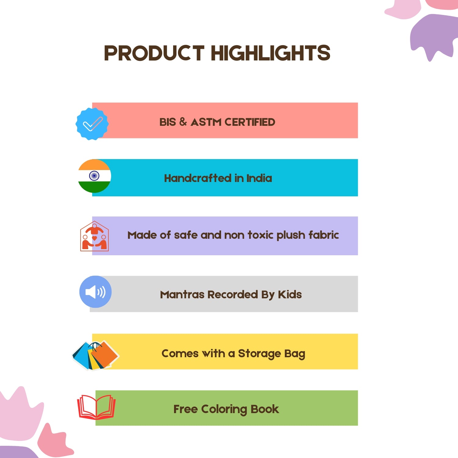 - Press each plushie's belly to hear calming mantras ā engaging children in a fun, musical spiritual learning experience.