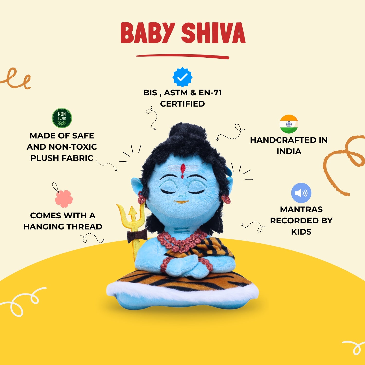 • Press the plushie’s belly to play Shiv mantras—introducing little ones to music, rhythm, and spiritual learning.