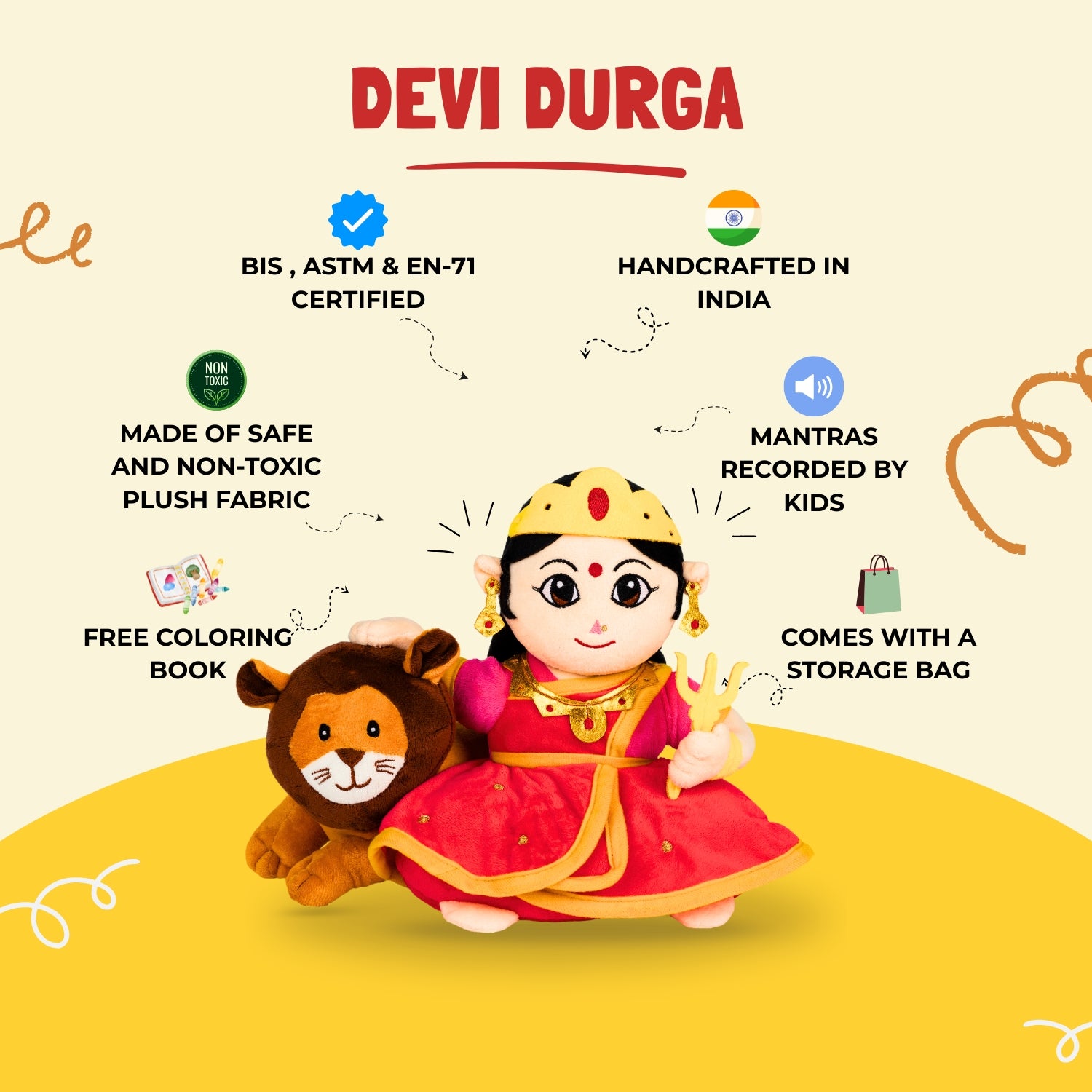 - Press the plushie’s belly to play Durga mantras—introducing little ones to music, rhythm, and spiritual learning.