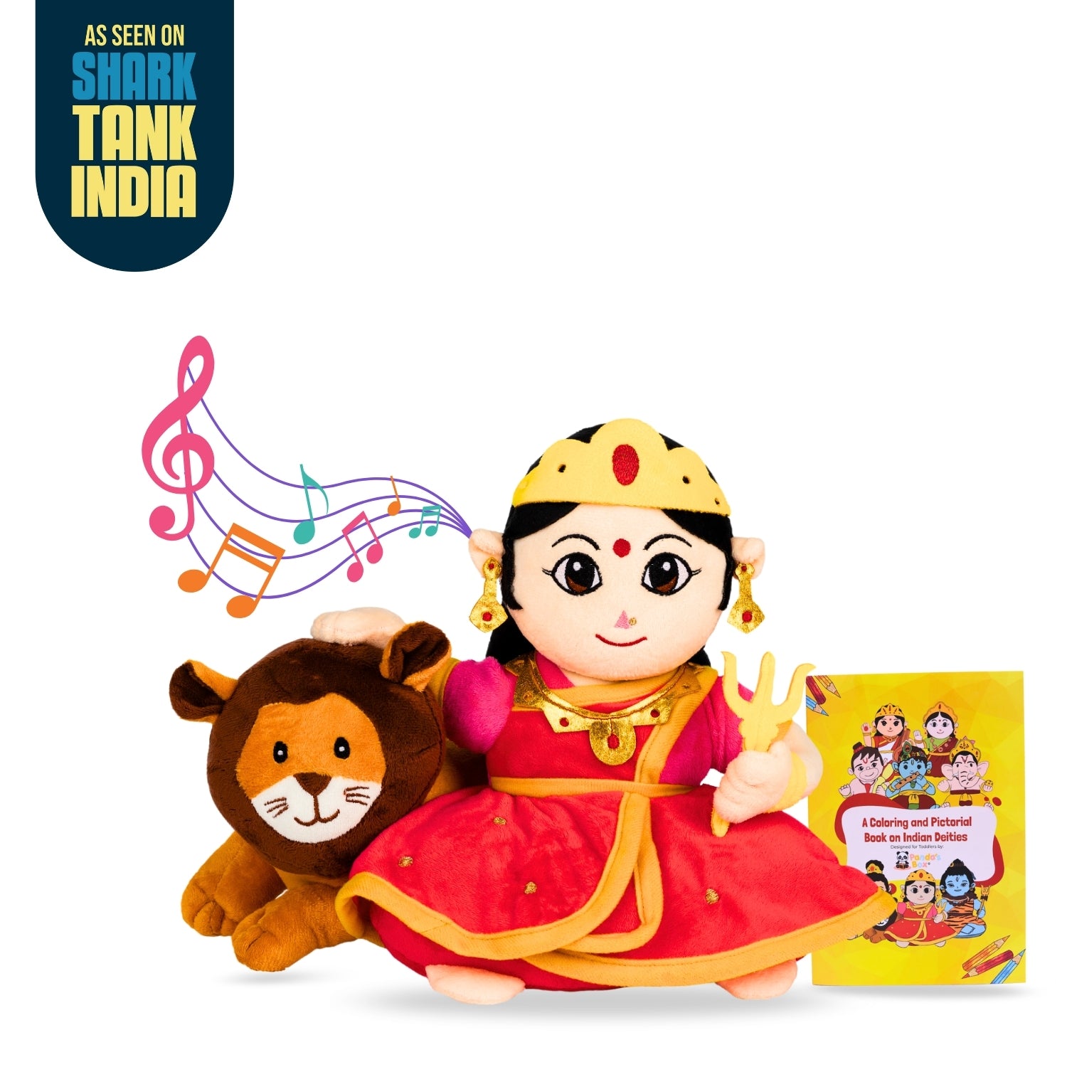 - Meet Devi Durga : Let your child connect with Devi Durga, the symbol of strength, courage, and divine protection. This soft mantra chanting toy by Panda’s Box helps children learn about India’s powerful goddesses through joyful, comforting play.