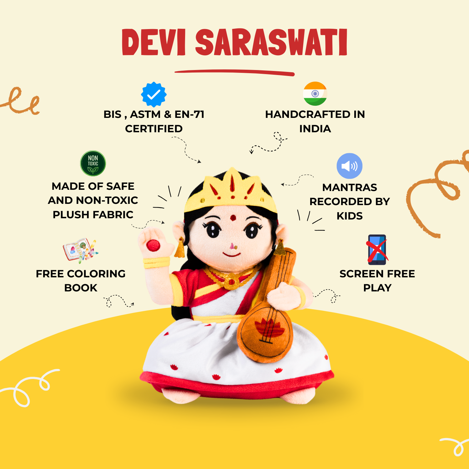 mantras encourages focus, calmness, and clarity — perfect for creating a peaceful learning environment. Each mantra is recorded in a gentle child’s voice, offering a soothing and authentic sound experience that children instantly connect with. - Safe & Cuddly Design : Crafted with non-toxic, super-soft plush fabric, this musical plush toy is lightweight, huggable, and safe for ages 0–5 years. Designed in bright, elegant colors, it embodies grace and purity — just like DeviSaraswati herself.