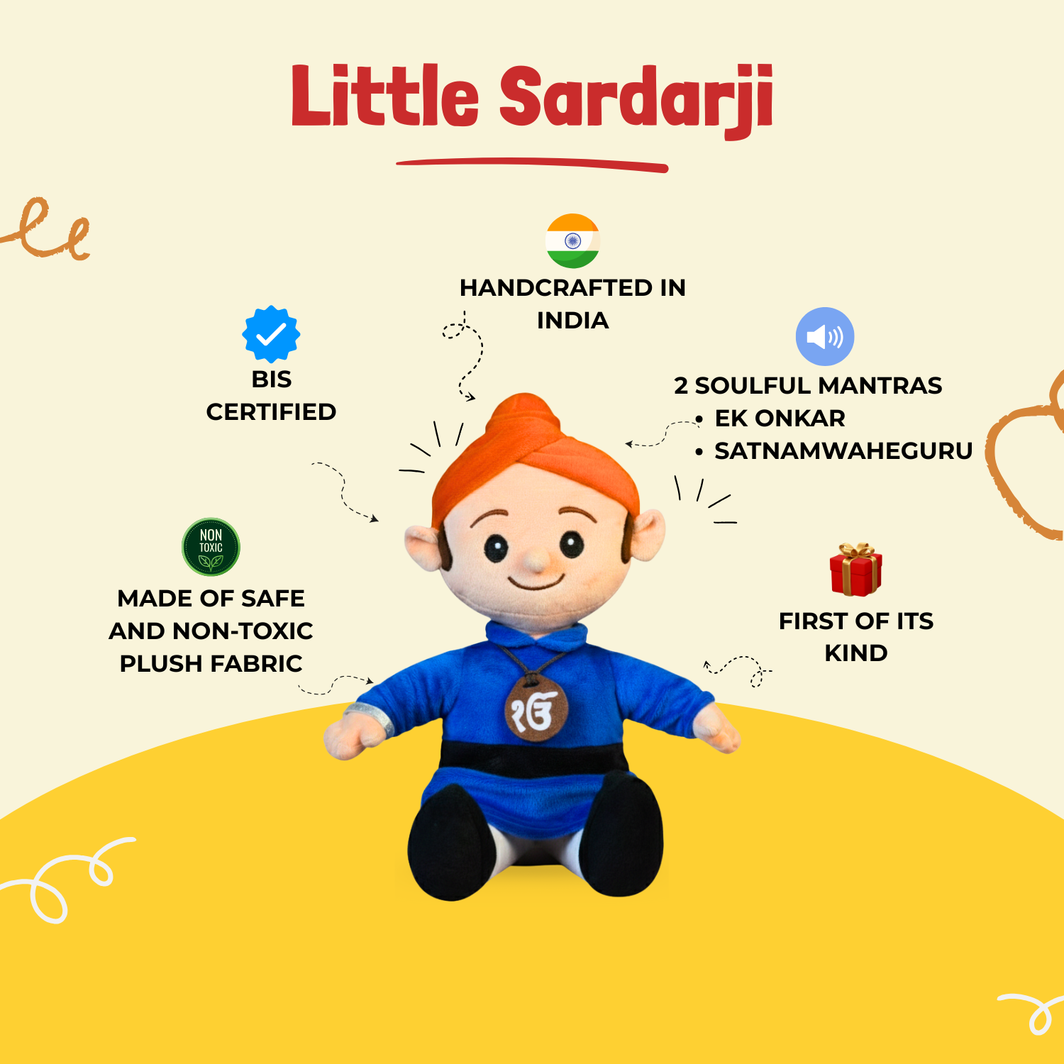 Introducing Little Sardarji, the softest, most soulful companion designed to bring faith and fun into your little one’s life. With a gentle press, Little Sardarji comes alive, filling the room with the soothing vibrations of the Mool Mantar and Gurmantra. - Inspiring Little Hearts : We believe that learning about our heritage shouldn't be a chore—it should be a cuddle! Designed with love and respect, Little Sardarji wears his identity with pride, helping Sikh children see themselves represented in their toys while learning the core prayers of their faith. Whether it’s playtime or bedtime, he is there to remind them: Waheguru is always with you.