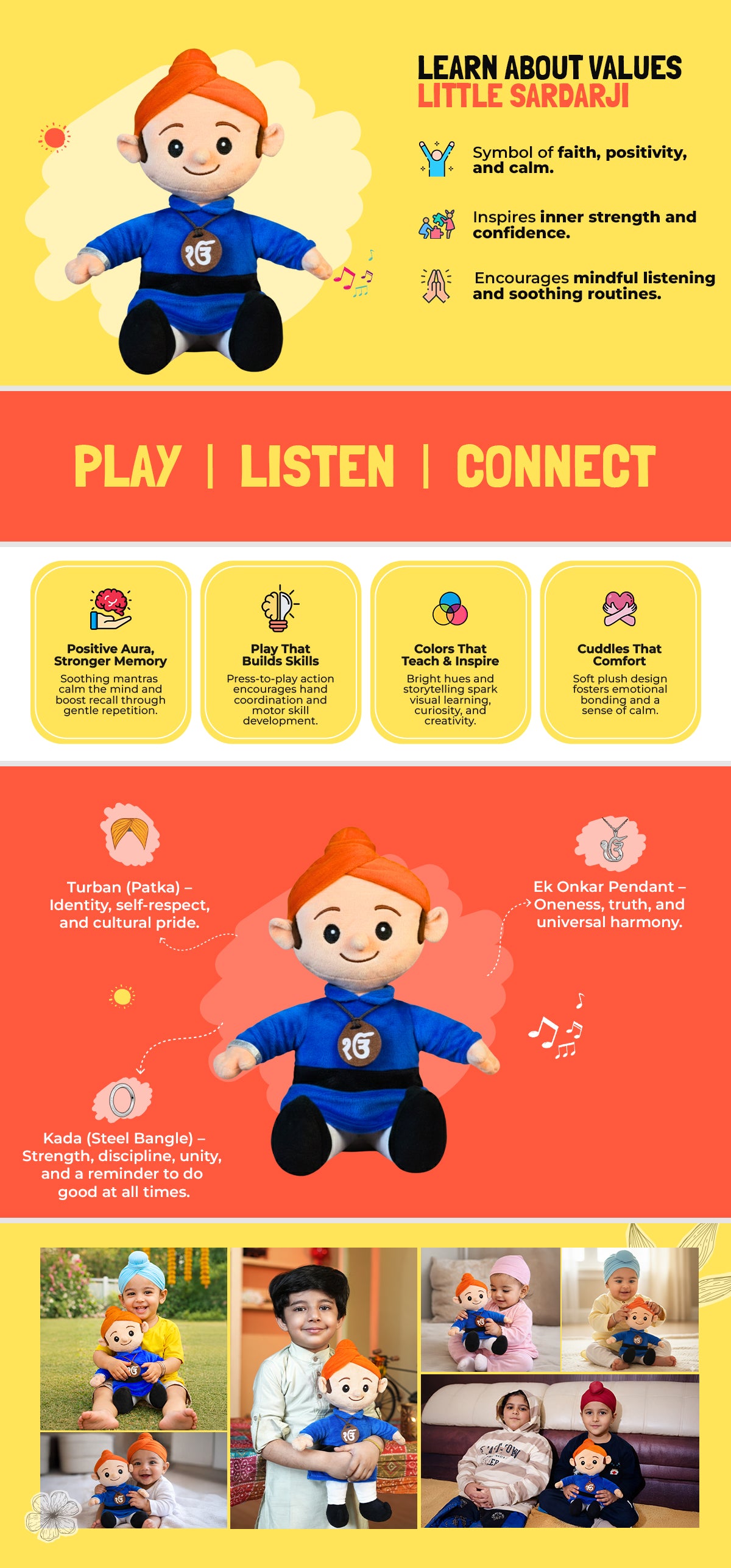 - Interactive Play Experience : Press Little Sardar Ji’s belly to hear soothing Sikh mantras that fill the room with peace and positivity. The press-to-play feature keeps children engaged while supporting motor skill development and sensory exploration through sound and touch.