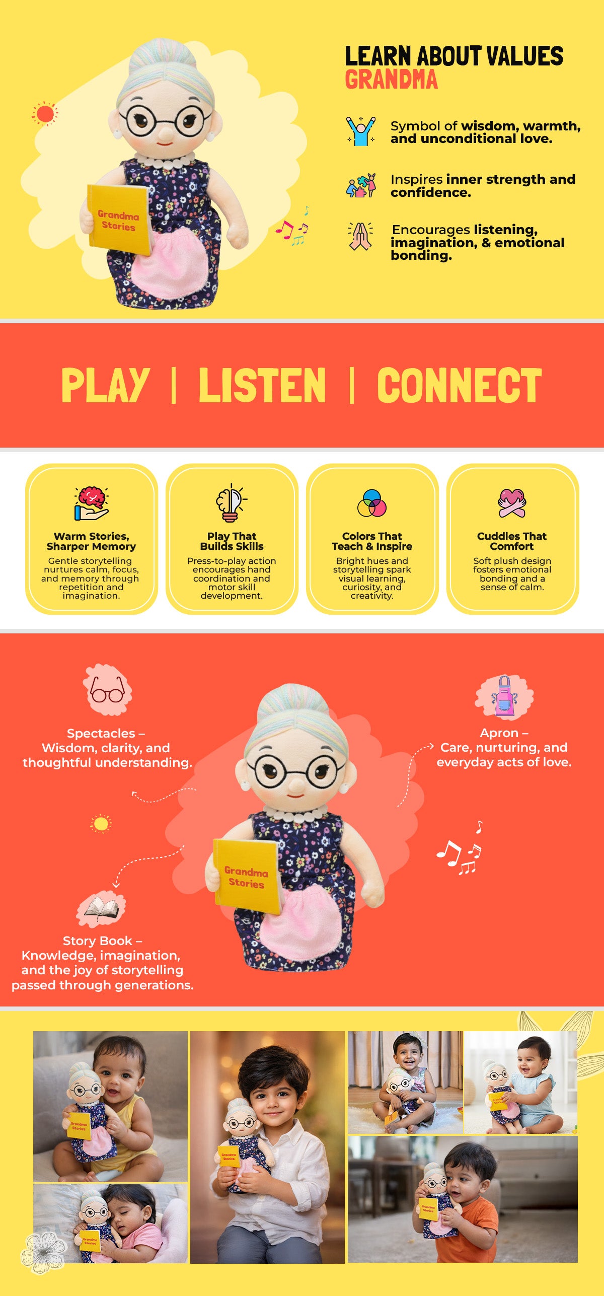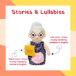 - Bring home the gentle comfort of a grandmother’s storytelling with Storyteller Grandma by Panda’s Box—a soft, huggable plush that shares timeless stories and soothing lullabies in English. Thoughtfully designed to recreate the magic of bedtime tales, Grandma helps children learn values, spark imagination, and feel safe and loved—one story at a time.